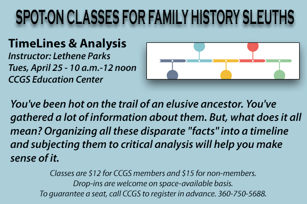 CLASS FOR GENEALOGY SLEUTHS: TIMELINES AND ANALYSIS Tuesday, April 25, 10 a.m. – 12 noon CCGS Education Center Instructor Lethene Parks