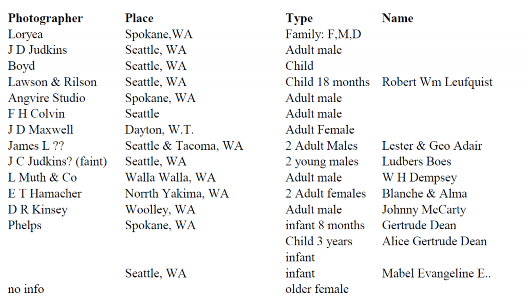 WSGS has received a packet of photos from Shelley Cardiel in Portland, OR. I’ve attached a compiled list of the photos. Some info is faint & difficult to read… In addition I can scan them and place them on our website in the Gallery.