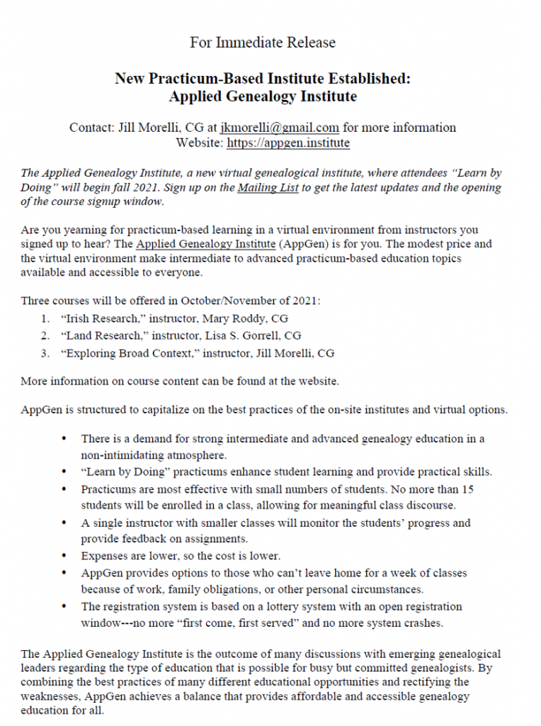 Mary Kircher Roddy, CG, Lisa Hork Gorrell, CG and Jill Morelli, CG are happy (gleeful even) to announce a new virtual practicum-based learning option for genealogists! Do you best “Learn by Doing”? Do you want smaller classes that allow for significant class discussion and to receive responses to your assignments–all at an affordable price? Then the Applied Genealogy Institute is for you! Check us out at https://appgen.institute and sign up for the mailing list at the website to be the first to get our opening window for registration.