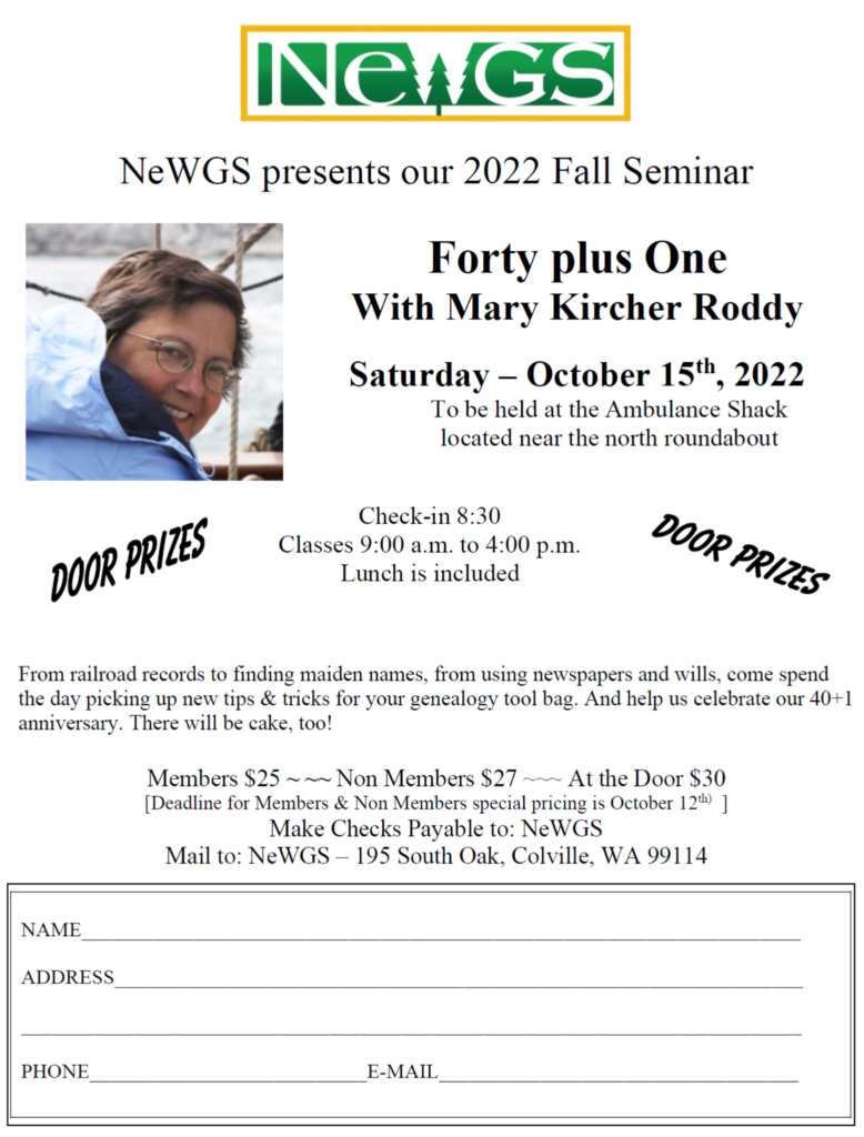 Besides being a member of WSGS (since 1984) and EWGS, Donna is a member of the Mayflower Society, DAR, St. Clair County (Illinois) Genealogical Society, National Genealogical Society, Whitman County Genealogical Society and the Northeast Washington Genealogical Society. In addition, Donna was named a WSGS Outstanding Volunteer in 2008 and 2014. That’s a lot of genealogy, but that’s what Donna does!