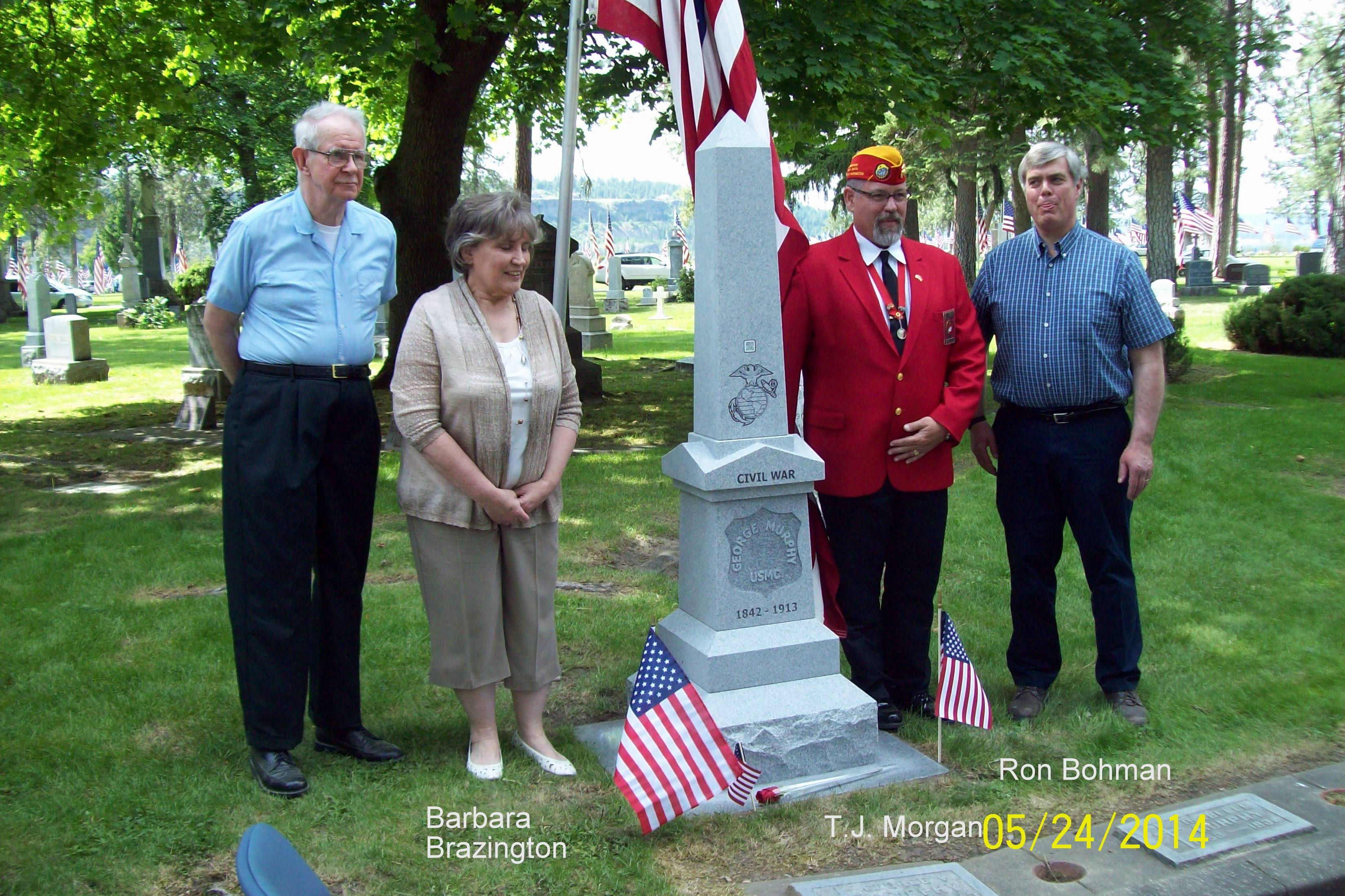 George Murphy was a Marine in the Civil War, and since there were only 4000 Marines in the Civil War, so to have two Marines buried in Spokane, Washington is kind of rare. George did not have any kind of a military marker at Fairmount Cemetery and so Barbara Brazington tried to get a Civil War marker for him, but since she was not related they refused, so she contacted the local Marine League, and they got a marker donated by a local company and set up a wonderful memorial service. Go here to see the full story .
