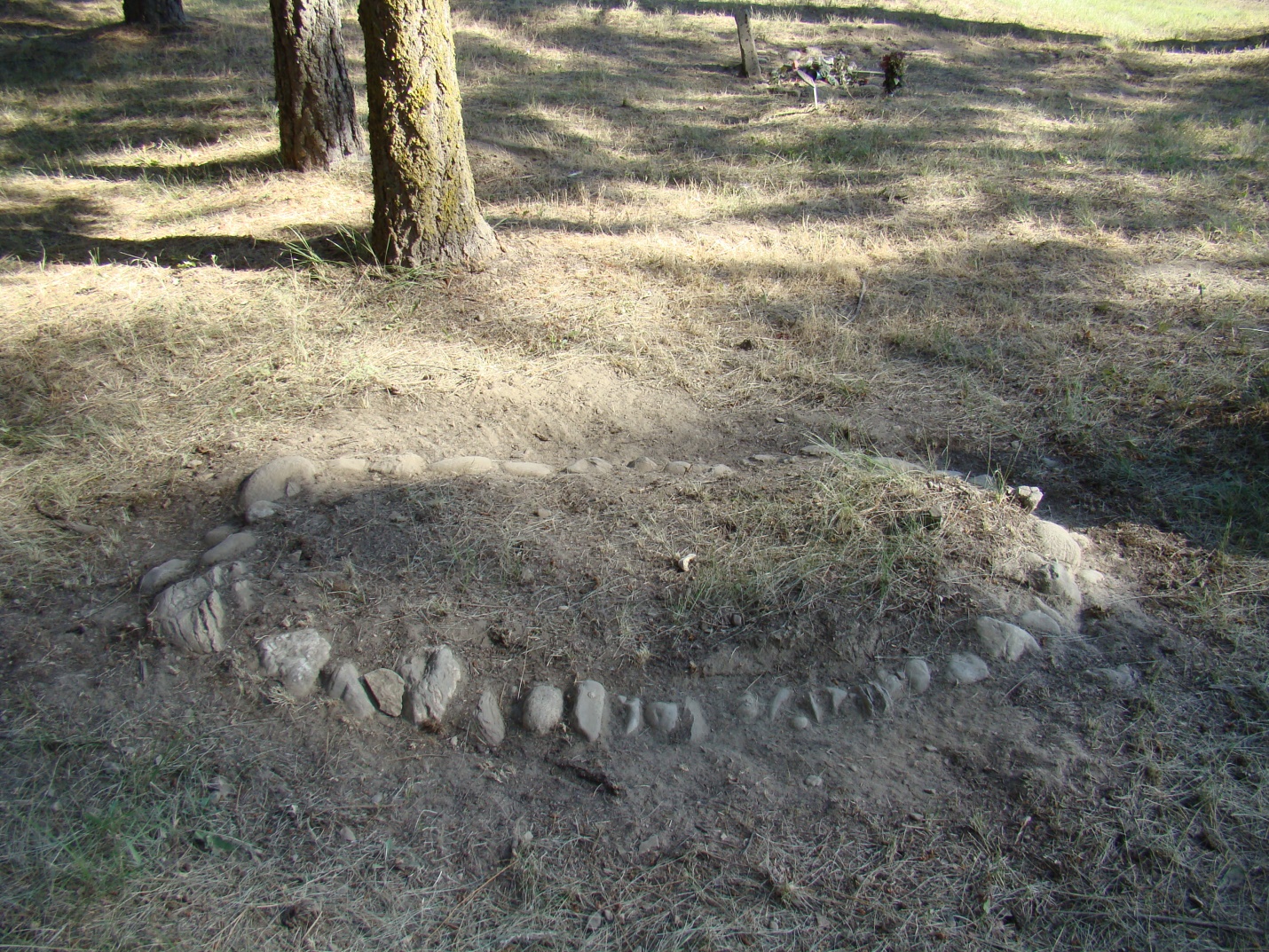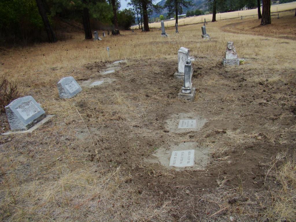 Forward to 2015 and Evergreen Cemetery in Colville, Washington. I’ve been working with Gordy Struve over the last year to memorialize those interred at Evergreen Cemetery on our Northeast Washington Genealogical Society web site. With over 600 known burials, it is a big project done mostly in the wet, cold and low light months. I’m starting to know the people, their families and their stories. Spring and summer provides physical work at the cemetery. Over time we’ve had work parties to clean the grounds, limb or cut down trees & brush, fix fence, roads & grave markers, install signage and other duties as assigned. A weed whacker is my tool—I’ve cleaned the north half of Stevens County with various forms of this beast, but I can be tender and exacting as a surgeon. When the soil turns to dust, I’ve spent a bit of time bringing the graves out of their hiding places. Genealogists thrive on mysteries, always looking for a clue….and unmarked graves leave clues, sometimes depressions, sometimes mounds, often a lilac bush stump at the head of the grave or perhaps a large stone. Most markers face east and you can pick out the grid-like pattern of plots and graves by looking end to end through the cemetery. I start at the head of the grave, gently teasing the next rock that lines the oval shape of the grave. Exposing only the tops, I continue around until……another grave is accounted for. Our previous generations used to completely cover a grave with stones or most often just put them on the rim of grave.