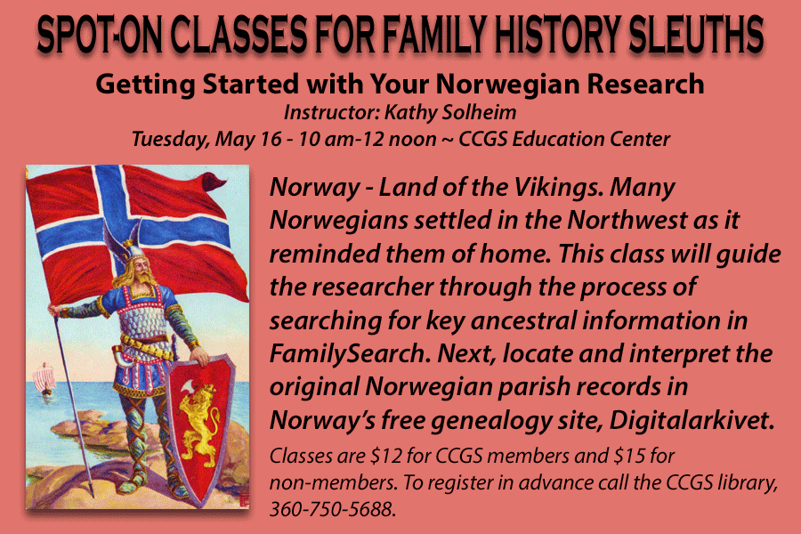 Classes are $12 for CCGS members and $15 for non-members. Drop-ins welcome on space available basis. To register in advance call the CCGS library, 360-750-5688.