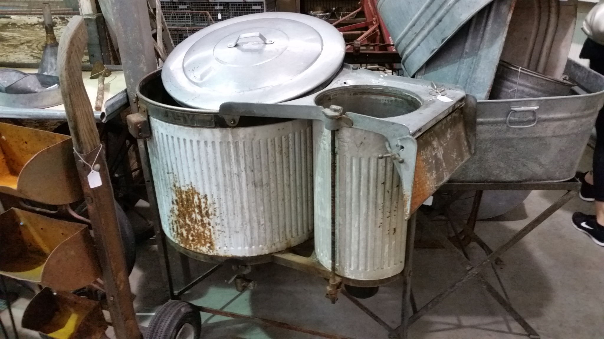 The washtubs in the back look like the washtubs my grandma used when she washed. She had a wringer washer with a roller on the side to squeeze the soapy water from the clothes. Then she had two washtubs full of very hot water to rinse the clothes before running through the rollers again, then outside to the clothes lines in the back yard to dry