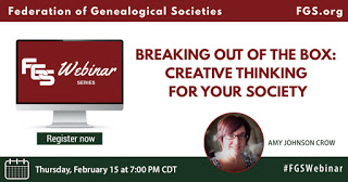 The Federation of Genealogical Societies (FGS) is is pleased to announce the February 2018 webinar, “Breaking Out of the Box: Creative Thinking for Your Society,” presented by Amy Johnson Crow, CG, MLS. Doing the same thing over and over isn’t just boring. It could strangle your society. Look at some ways to get the creative juices flowing and find new solutions.