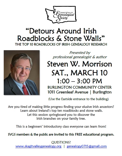 BURLINGTON — Irish genealogy research can be very challenging. Come learn from an expert on Irish research – professional genealogist, Steven W. Morrison, how to overcome those “roadblocks and stone walls.” Steven will share in this beginner level presentation the top 10 challenges and how to work-around them. The Skagit Valley Genealogical Society offers educational programs on the 2nd Saturday of the month from 1-3 pm at the Burlington Senior Center (enter on the east side of the building), 1011 Greenleaf Ave., Burlington. This special lecturer program on Sat., March 10 is offered free to both SVGS members and to first time visitors. Email: genealogy0715@gmail.com or visit www.skagitvalleygenealogy.org for details.