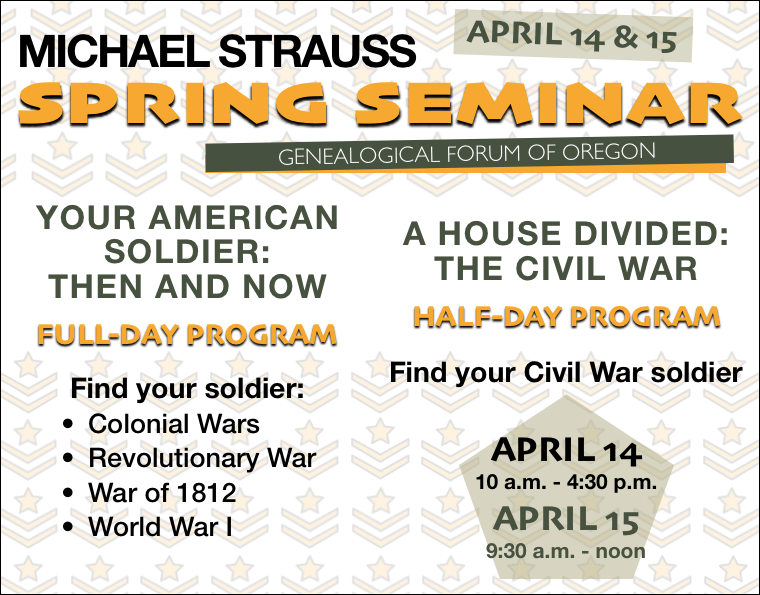 How can you prove your ancestors fought in the American Revolution, War of 1812, Civil War or World War I?Come hear one of the most engaging national experts in military records at the GFO’s Spring Seminar April 14 & 15. We’re bringing Michael Strauss in for two great days of lessons. |