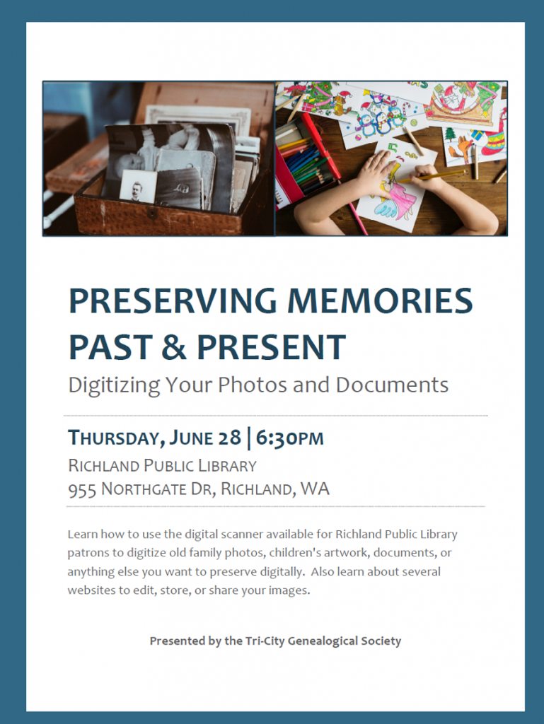Here is an opportunity for you to take advantage of a class at the Richland Public Library which is being sponsored by TCGS and hosted by the library. Heather Murphy will be teaching this class on Digitizing Your Photos & Documents.
