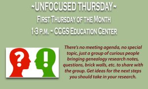 There’s no meeting agenda, no special topic, just a group of curious people bringing genealogy research notes, questions, brick walls, etc. to share with the group. Get ideas for the next steps you should take in your research.