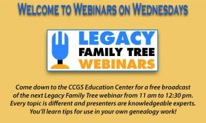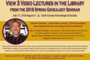 The 2018 Spring Genealogy Seminar featured David Allen Lambert, Chief Genealogist for the New England Historic Genealogical Society. Those who attended the Seminar gave rave reviews for the extensive information packed into three educational sessions. Topics covered are World War I Military Records, Settlers and their Treasures in the Great Migration West Era (shown July 17, 10 am-12:30 pm), and Probate and Deed Records Research (shown July 24, 10 am-12:30 pm). All three are showing on August 4, 10 am-3 pm. If you were unable to attend, here is an opportunity to view the lectures via professional video productions. Each session is $12 for CCGS members and $15 for non-members. Check the website at www.CCGS-WA.org for more details and registration.