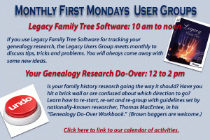 If you use Legacy Family Tree Software for tracking your genealogy research, there is a Legacy Users Group that meets monthly to discuss tips, tricks and problems. You will always come away with some new ideas. The meetings are held regularly on the first Monday of the month. Members and non-members are welcome.