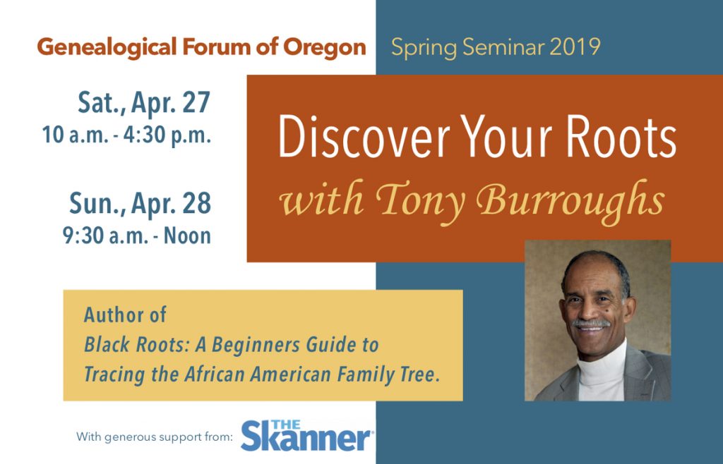 You’ve seen him on TV on Oprah’s Roots and Finding Your Roots with Henry Louis Gates. Now come hear him in person for a day and a half of superb genealogy lessons. We are thrilled to be able to bring professional genealogist and Fellow of the Utah Genealogical Association Tony Burroughs to Portland for our Spring Seminar April 26th and 27th. In