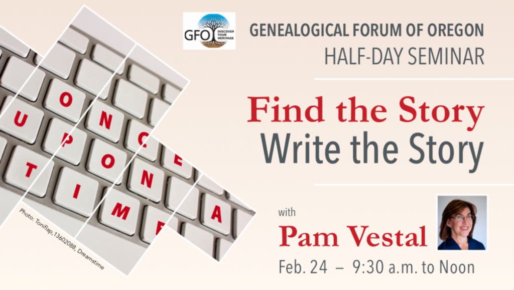 Find the Story, Write the Story: Half-Day Seminar Join professional genealogist Pam Vestal for a half-day seminar at the GFO on Sunday, February 24th from 9:30 a.m. to noon. Topics: Teasing Out the Hidden Story Behind the Genealogical Facts. Learn to dig deeply into the genealogical details and to breathe life into your ancestors’ stories. How to Write Ancestral Stories Even Your Relatives Will Want to Read. With good research, thoughtful planning, and a dash of ingenuity, you can create engaging genealogical stories designed to entice even seemingly disinterested readers. Register online now! |