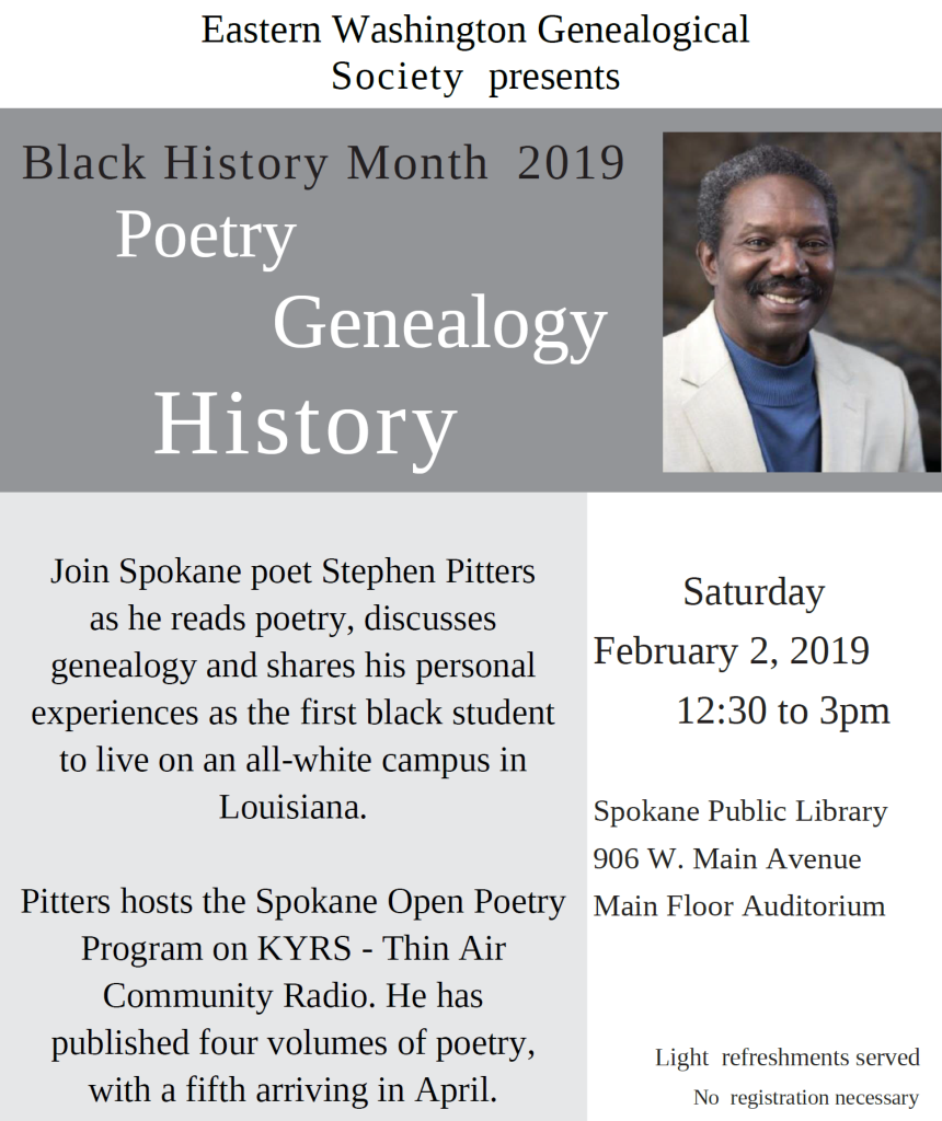 Saturday, February 2 Black History Month (EWGS Meetings) 12:30 pm to 3:00 pmSpokane Public Library Auditorium – Downtown Spokane – Main Floor Black History Month 2019 Poetry – Genealogy – History Join Spokane poet Stephen Pitters as he reads poetry, discusses genealogy, and shares his personal experiences as the first black student to live on an all-white campus in Louisiana. Pitters hosts the Spokane Open Poetry Program on KYRS-Thin Air Community Radio. He has published five volumes of poetry, with a sixth arriving in February or March.
