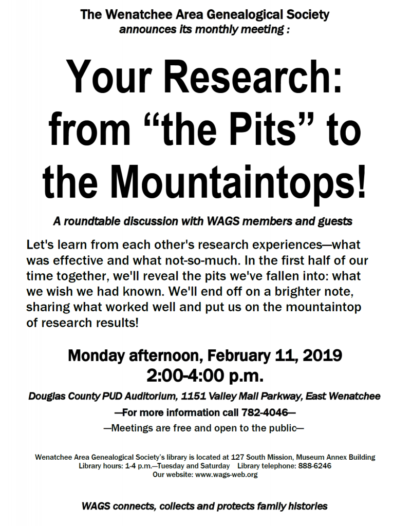 Monday, February 11Wenatchee Area Genealogical Society2:00 p.m. to 4:00 p.m. (Local society meetings)Douglas County PUD Auditorium1151 Valley Mall Parkway, East Wenatchee WAGS members and guests are invited to a round table discussion on”Your Research: from ‘the Pits’ to the Mountaintops!” where we will share, first, mistakes we have made; and second, things we did well in our research. Come and profit from others’ experiences!