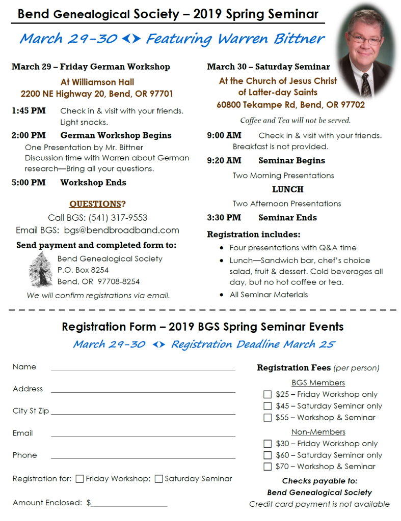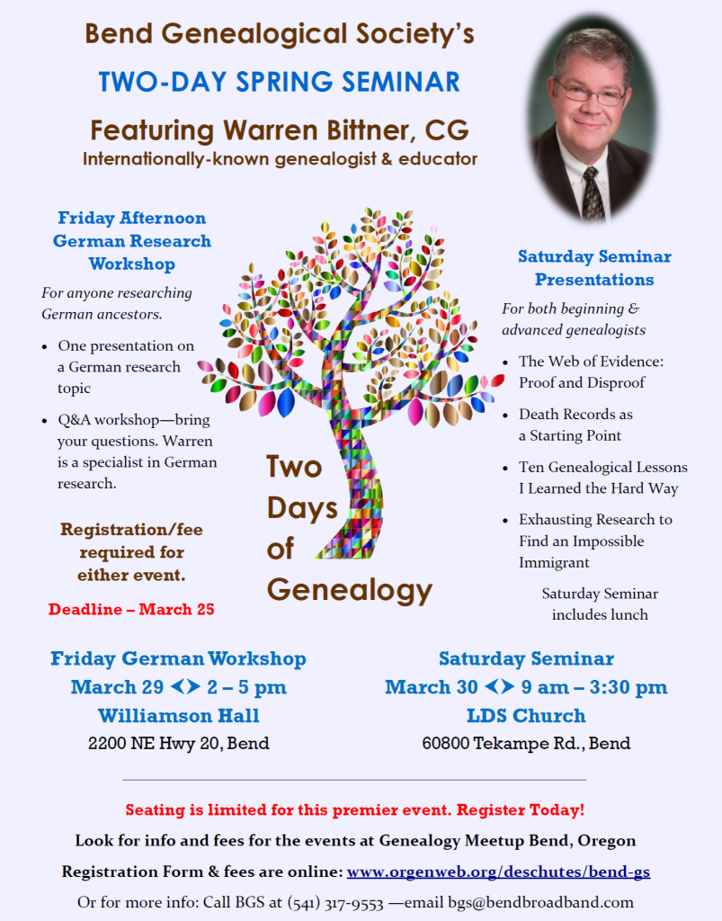 We are excited to announce our upcoming Seminar events, which are on two days this year.Warren Bittner, CG, nationally-known genealogist and educator, will be in Bend for a Friday afternoon German research workshop on March 29; and a Saturday all-day Seminar on March 30 with four presentations that will benefit both beginning and advanced genealogists. The Web of Evidence: Proof and DisproofDeath Records as a Starting PointTen Genealogical Lessons I Learned the Hard WayExhausting Research to Find an Impossible Immigrant