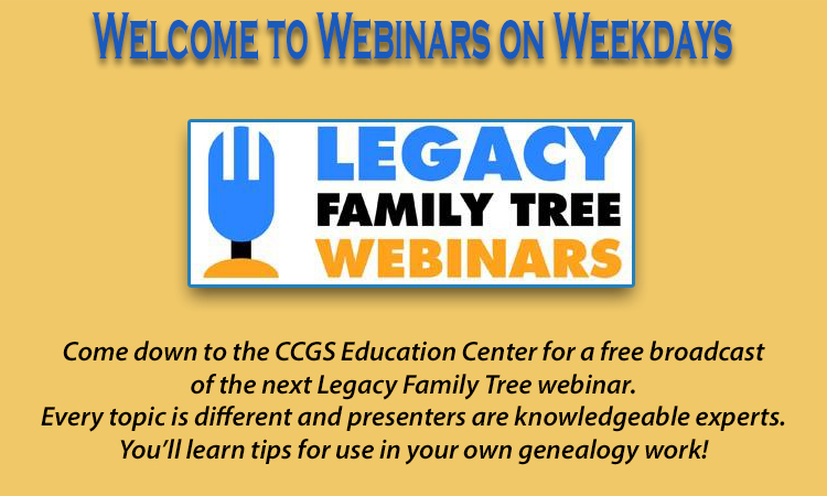 If you use Legacy Family Tree Software for tracking your genealogy research, there is a Legacy Users Group that meets monthly to discuss tips, tricks and problems. You will always come away with some new ideas. The meetings are held regularly on the first Monday of the month. Members and non-members are welcome.