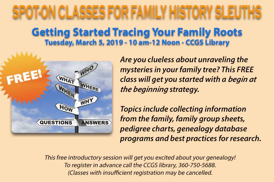 This class starts your family tree research with a begin at the beginning strategy. Topics will include collecting information from the family, family group sheets, pedigree charts, genealogy database programs, and best research practices. Taught by highly regarded genealogist and CCGS member, Elsie Deatherage.