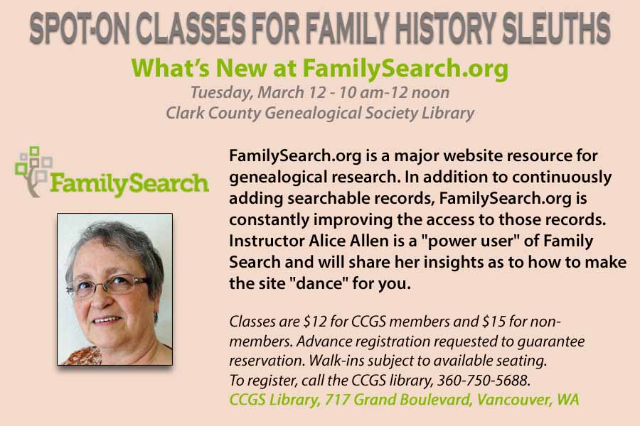Join Alice Allen to learn about the constantly changing and improving FamilySearch.org website. Find out what’s new and pick up tips and tricks to make your own Family Searching experience a successful one! Advance registration requested as class may be canceled with insufficient registrations. Walk-ins are accepted subject to available seating.