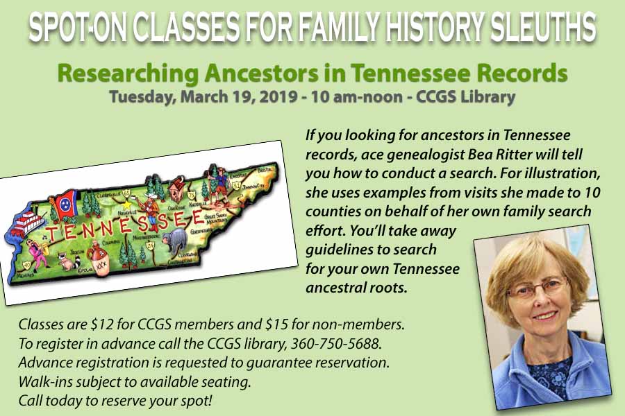 If you looking for ancestors in Tennessee records, ace genealogist Bea Ritter will tell you how to conduct a search. For illustration, she uses examples from visits she made to 10 counties on behalf of her own family search effort. You’ll take away guidelines to search for your own Tennessee ancestral roots. Advance registration is requested to guarantee reservation. Walk-ins subject to available seating.