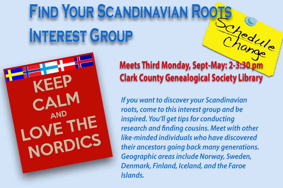 Do you find it hard to get to the Clark County Genealogical Library during daytime hours? Come in on Third Thursday to tap into our richest resource: knowledgeable librarians who can help you with your family history search. We won’t do it for you, but we will provide guidance. One librarian has Scandinavian research expertise. The library has over 10,000 books and resources, and free access on our computers to Ancestry.com and AmericanAncestors.com. Bring your own computer and use our free wifi.