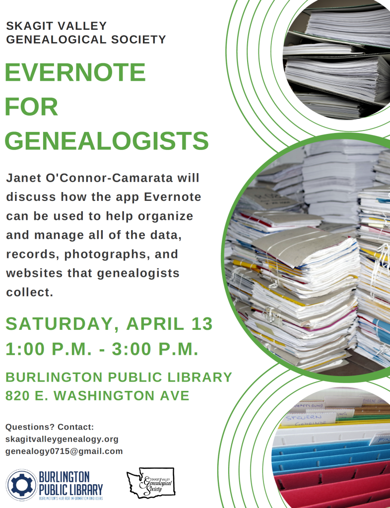 Upcoming educational program we are offering on Saturday, April 13, 2019 from 1:00 p.m. to 3:00 p.m. in partnership with Skagit Valley Genealogical Society. The topic of the program is “Evernote for Genealogists” and will be presented by Janet O’Connor-Camarata. This event is free and open to the public. I’ve attached a flyer with more information. Please feel free to forward or post on any wall you wish! We appreciate your help in getting the word out, because we would like as many people as possible to benefit from our programs.