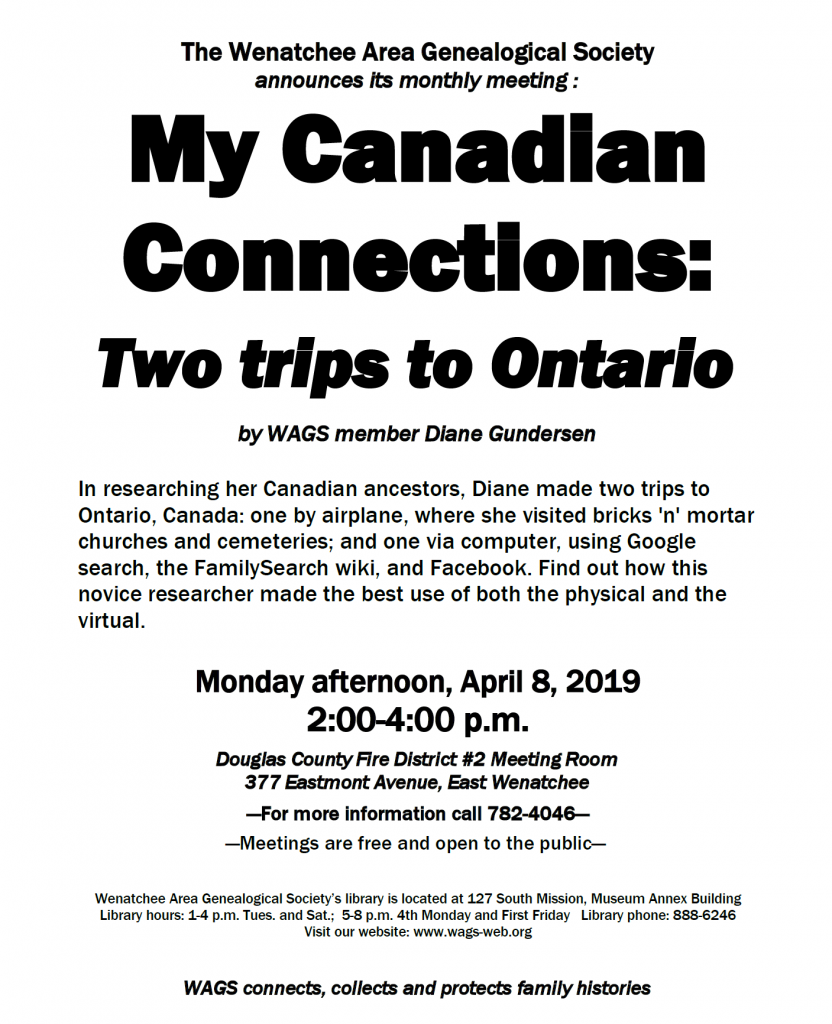 Wenatchee Area Genealogical Society April Meeting