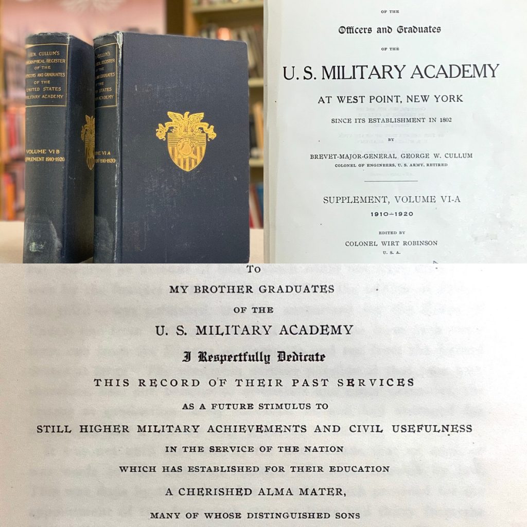 | We have a surplus book set available with valuable military listings. Gen. Cullum’s Biographical Register of the Officers and Graduates of the United States Military Academy lists names of men to pass through West Point from 1910-1920. |