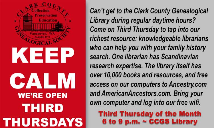 Do you find it hard to get to the Clark County Genealogical Library during daytime hours? Come in on Third Thursday to tap into our richest resource: knowledgeable librarians who can help you with your family history search. We won’t do it for you, but we will provide guidance. One librarian has Scandinavian research expertise. The library has over 10,000 books and resources, and free access on our computers to Ancestry.com and AmericanAncestors.com. Bring your own computer and use our free wifi.