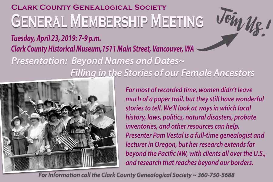 For most of recorded time, women didn’t leave much of a paper trail, but they still have wonderful stories to tell. We’ll look at ways in which local history, laws, politics, natural disasters, probate inventories, and other resources can help. Presenter Pam Vestal is a full-time genealogist and lecturer in Oregon, but her research extends far beyond the Pacific NW, with clients all over the U.S., and research that reaches beyond our borders.
