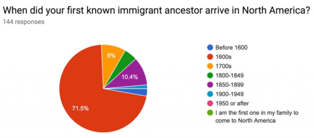 Last week we asked you when your first known immigrant ancestor arrived in North America. A large majority have deep roots extending back to colonial times. ▪ 71.5 % answered 1600s. ▪ 2.8 % said they came even earlier, pre-1600. ▪ 9% said the 1700s. ▪ 15.3% said the 1800s. ▪ 1.4% said the 1900s.