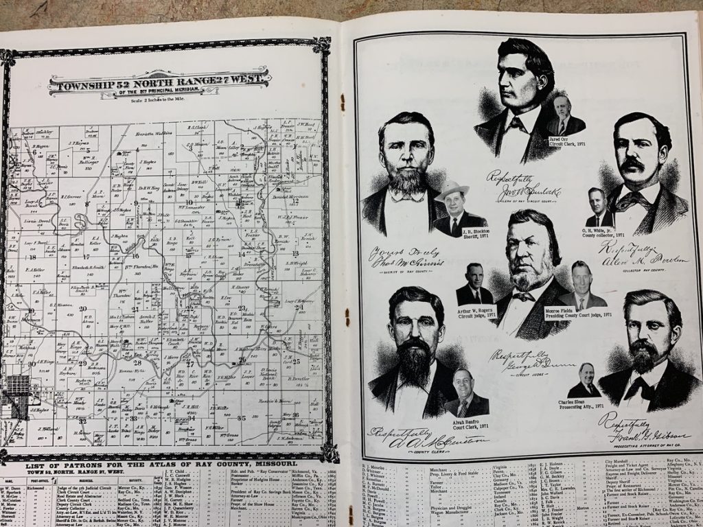This week’s surplus book is another oversized atlas book, focused on Ray County, Missouri. The maps of all the townships, and illustrations of citizens and buildings, were done in 1877. This book is a 1971 reprint by The Richmond News, published for the Ray County sesquicentennial. This book is in good condition physically with intact pages and spine. However, it does have marks in red pen on some pages where a previous researcher highlighted properties of interest.