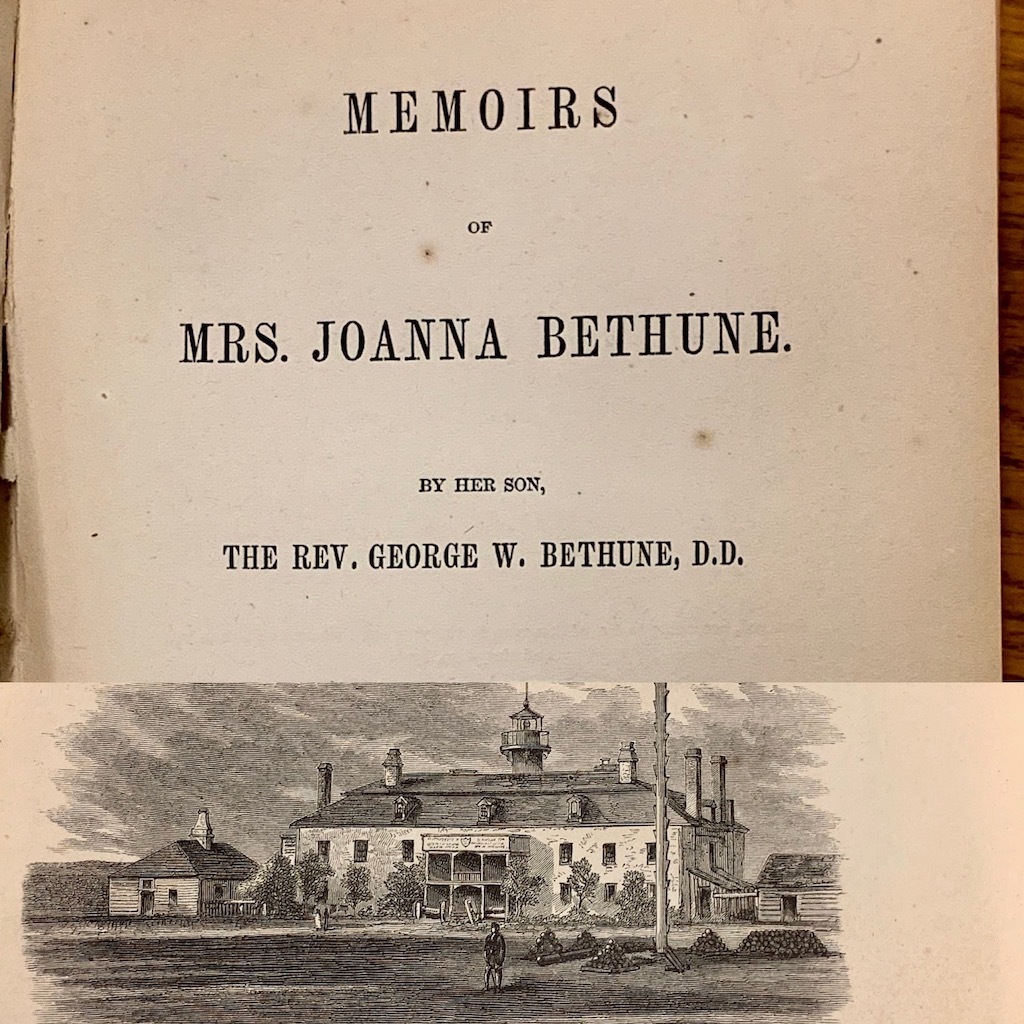 | The Rev. Dr. George W. Bethune wrote a short biography of his mother, Mrs. Joanna (Graham) Bethune, just a year before he died. “Memoirs of Mrs. Joanna Bethune. By her son, The Rev. George W. Bethune, D.D.” was published in 1863 by Harper & Brothers, Publishers in New York. He was described as an “eloquent and distinguished scholar, poet, preacher, and orator… but nothing from his pen will be read with greater admiration than this simple memorial of the mother who taught him to speak.” His tribute to his mother is joined by a 125-page appendix full of his mother’s own writings. |