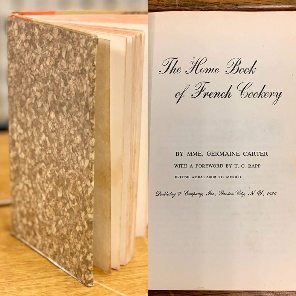 | Sometimes we receive books that have nothing at all to do with genealogy. Here’s a perfect example. The Home Book of French Cookery by Mme. Germain Carter includes a foreword by T. C. Rapp, British Ambassador to Mexico. Carter wrote this recipe book in 1950, eleven years before Julia Child released her tome on French Cooking. What is most remarkable is that she wrote the bulk of it while a prisoner of war during World War II, exiled to four different internment camps, as Germany controlled her French countryside. |