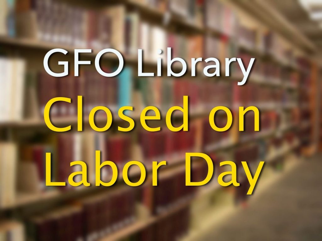 | Please remember that the GFO Library will be closed on Labor Day, Monday, September 2. Our usual Free First Monday for the public will be honored one week later on Monday, Sept. 9. |