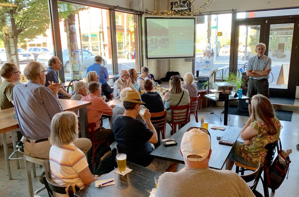 | Fifty-year railroad industry employee Bill Burgel gave an eye-opening presentation at the Ford Food & Drink cafe above the GFO library on Monday about why we see so many trains blocking the roads near the Ford Building. Bill did not speak on behalf of any company, but he’s been intimately involved in rail operations in Portland for years, so he knows the ins and outs of the rail lines and roads. Thirty-six people came out to hear him, including State Representative Rob Nosse and employees of the city of Portland. |