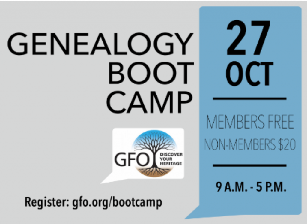 you can keep going as the class does. Free for GFO members! Just $20 for non-members. Genealogy Boot Camp for Beginners on October 27th has lots of seats still available. Please register today! |