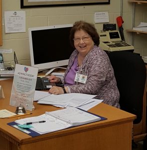 | Jane McGarvin greeted new arrivals and handed out visitor passes. 48 energetic volunteers + 4 dozen donuts and a dozen bagels + 40 cups of coffee + 9 large pizzas + some miscellaneous goodies = 218.5 hours of laughter, discovery, and library organization! That’s