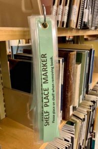| You’ll soon be seeing more of these at the GFO–shelf markers to insert between books when a book is removed from the shelf. President Vince Patton saw something similar at a library in California, and Mac McGarvin has taken on the job of creating shelf markers for us. (Thanks to Vince and Mac.) They will be hanging on hooks in the aisles. Take a book off the shelf … insert a shelf marker … reshelf a book … pull the marker and return it to the hook. Hopefully, this will help with getting books back to the right spot after our inventory. They are already getting rave reviews! |
