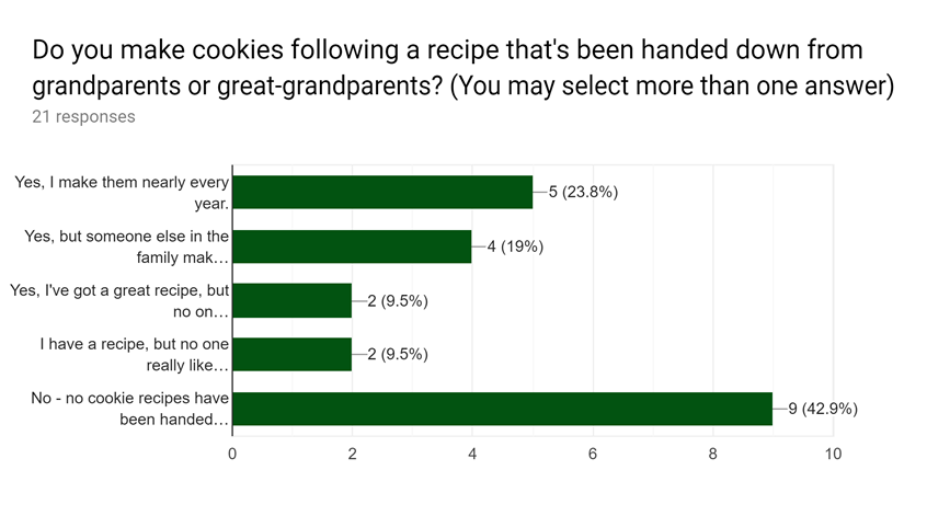 We were a little surprised that more people didn’t have holiday cookie or treat recipes handed down, but we did get a few interesting replies. (However, the survey editor is sad that the prior weeks’ respondents didn’t reach out to share their Thanksgiving cranberry sorbet or decadent spinach recipes.)
