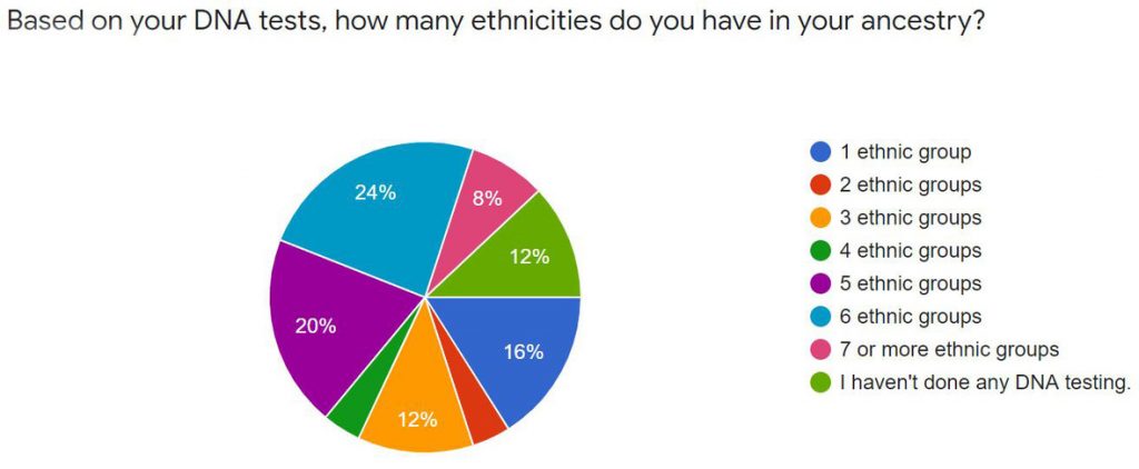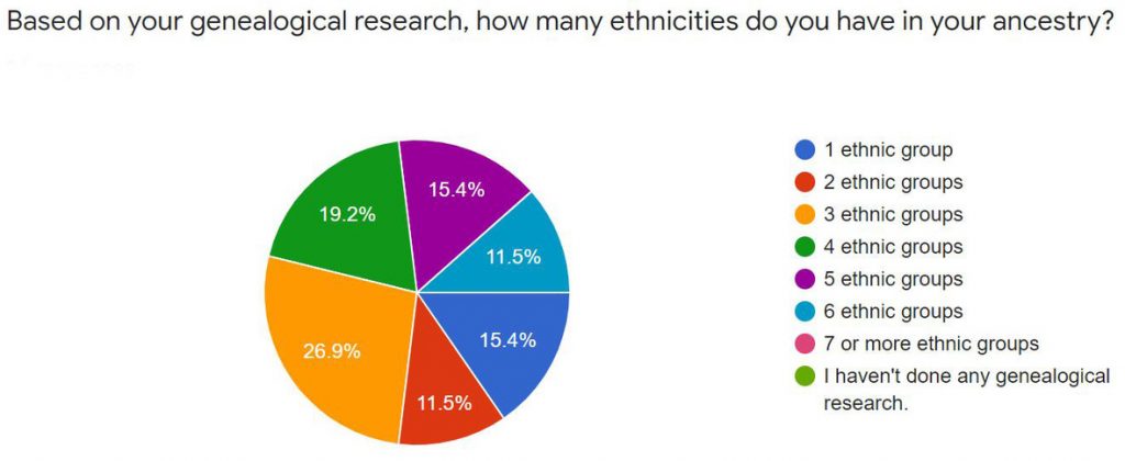 | Additionally, we would like to apologize for using the term “ethnicity” rather than speaking of regions of the world. Ancestry.com also uses “ethnicity” for its test results, while 23andMe uses “origins” and FamilyTreeDNA uses “ancestry composition.” One respondent was kind enough to point out the inaccuracy of “ethnicity” in their response; here is that response, in addition to some others we received: ▪ The word Ethnicity is a social construct and not a scientific one. Too many people mistake the DNA percentages as ethnicity when they are really admixture, bio-geographical or regional comparisons. The public needs to be educated on using the correct terms. I feel it is GFO’s responsibility to do so along with it’s members. After all, what makes one Irish or Swedish…is it because family lived there for 100 or more years? How can you call a person who has half their family white and half black …or even a drop of African heritage…as African American? We need more sensitivity and just state that they have ancestors from various REGIONS of the world. I know two people who are from England and look VERY English, but the Y-chromosome is African. He has no features similar to Africans, so he is considered white. Please do not use the term ethnicity; it’s better to even say cultural groups for your survey. Thank you. ▪ The stories were confirmed by the genealogy research and both were confirmed by the DNA testing. ▪ My ethnicity is Western European: German, French and Scots-English. DNA tests corroborated genealogy research and family stories. ▪ The “ethnicities” in the DNA tests are the most useless part (even if they are what helps sell them), so I don’t count them as anything other than white noise or cocktail party conversation. ▪ DNA can bring some real ethnic surprises. A very small amount of Black showed up in my sisters, second cousins and myself. Also a bit of Jewish and Native American where it comes from is a bit of a mystery. Our mother’s family was from Virginia and had been slave owners. The Jewish possibly came from dad’s Eastern European folks on his mother’s side is my guess. Sis and I are having a good laugh over it because mom was very adamant there was no Indian in her family and that grandpa was “black Irish” he had a dark complexion with black hair. Also how dare anyone think there was any thing but English and Irish in her back ground? We think it’s a real hoot for that reason. So much for family stories. ▪ Discovering the different ethnicities based on DNA has taken my research in a different direction–which has led to some successful discoveries. ▪ Fascinating to see that my ethnicity is more diverse than I’ve found or been told. But then, I don’t have all my ancestors for the last 200 years discovered yet! Do you? Onward … |