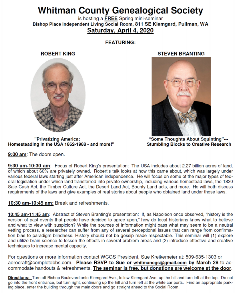 For questions or more information contact WCGS President, Sue Kreikemeier at: 509-635-1303 or aerocraft@completebbs.com. Please RSVP to Sue or whitmancgs@gmail.com by March 28 to accommodate handouts & refreshments. The seminar is free, but donations are welcome at the door.