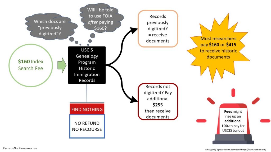 As of October 2, 2020, researchers will pay a minimum of $160 to initiate a records request, and pay up to $415 total to obtain certain historical records. USCIS will also impose additional fees if the requests are made by mail. There may also be additional fees to repay Congress, in the event of a bailout.