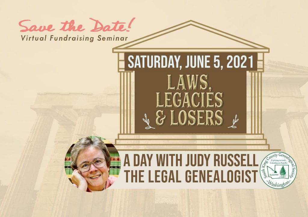 South King County Genealogical Society is pleased to announce a full-day virtual seminar with Judy Russell, a noted speaker, genealogist, and writer with a law degree. We hope you can join us for a fun and informative day. More details will be posted on our website at skcgs.org/seminar.html as updates become available.