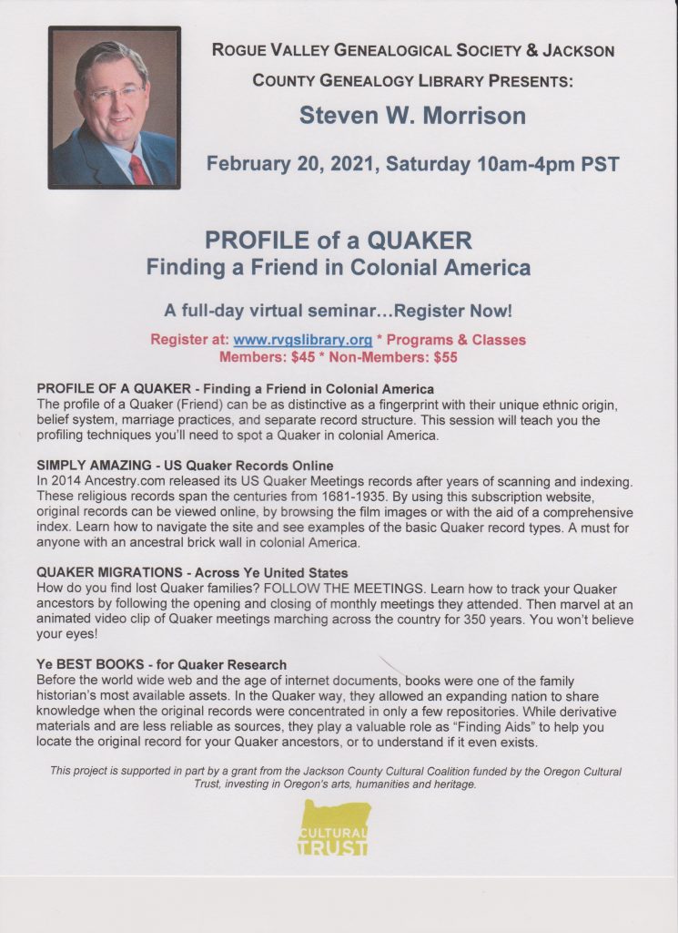 Nationally known speaker Steven W. Morrison will present this seminar on Quaker genealogy. See RVGS website for details on all sessions. Cost: Members $45, Non-members $55 (Please see attached Registration & Flyer.)