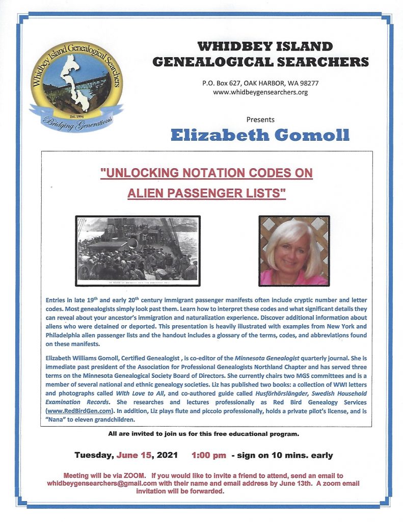 I would like to attend this June 15 “Unlocking Notation Codes on Alien Passenger Lists” Please send me the zoom link so I can log on. Thank you Linda Potter