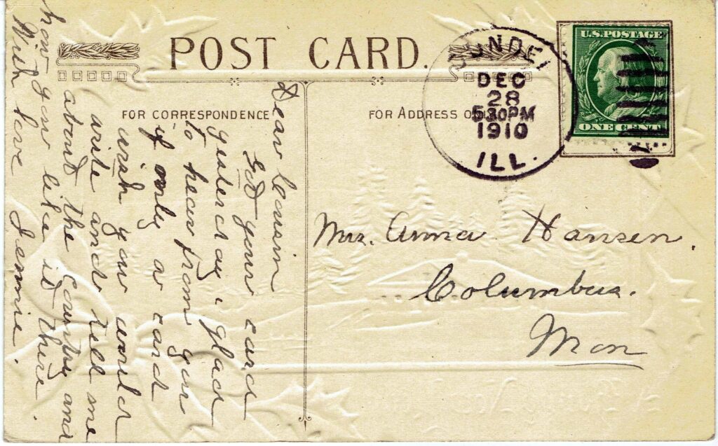 This is a postcard to my grandmother Anna (Dillingham) Hansen from Jennie (Cronk) Dillingham wife of Erlon Dillingham who was the first cousin to Anna. It was postmarked December 28th 1910 a few months after my grandparents had moved to Columbus, Montana. They were running the creamery at Columbus.