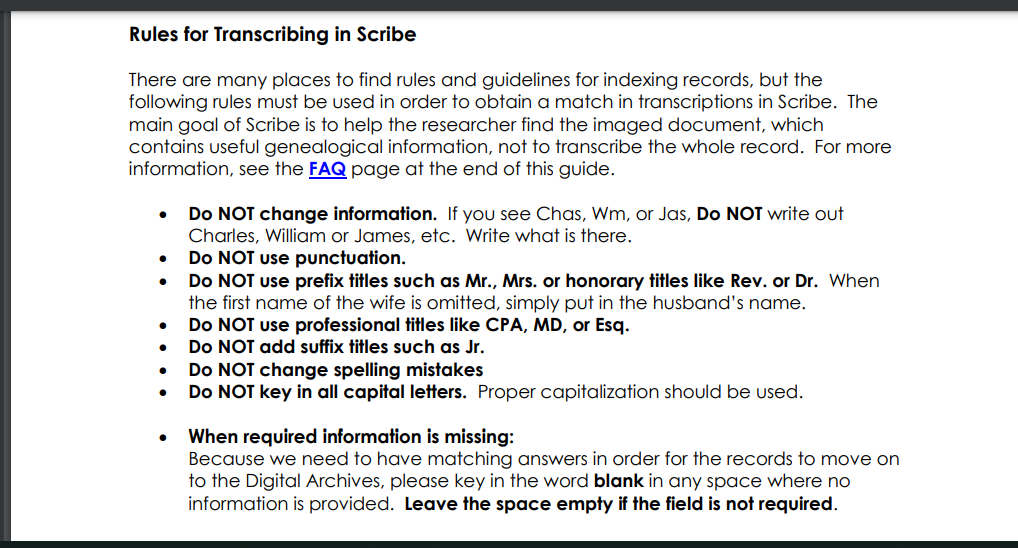 Scribe is the online application for entering this data. To volunteer to help you simply Register and Set Up your account, pick which record collection you’d like to work on, and start transcribing. It’s quick and easy. You work on this from the comfort of your own home, at your own pace. Do as many or as few records as you want, quit, and then pick it up again on another day.