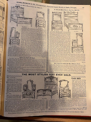 6-feet high and 4’6″ wide (full size today width is same), and is made from the choicest quarter-sawed oak. The footboard is one solid piece…… all three of these pieces, plus a washstand (not pictured) would set you back $59.00. Imagine!