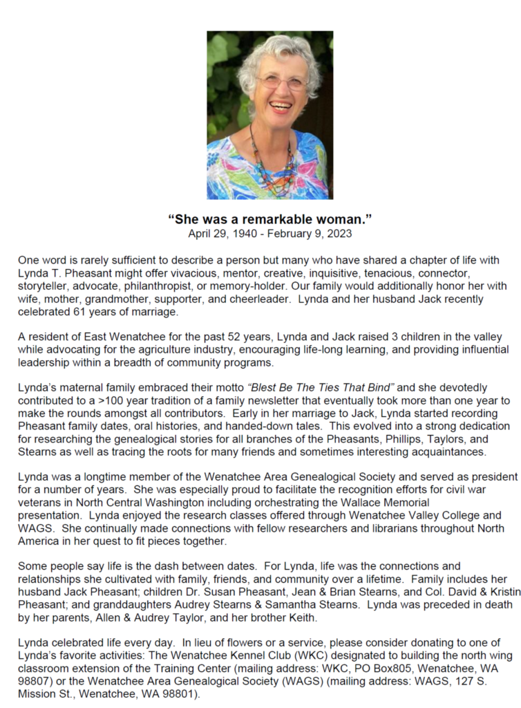 Whatcom Genealogical Society sends our sincerest condolences for the loss of Lynda T Pheasant. Wishing peace, and comfort to all.